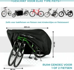 Wil je jouw fiets optimaal beschermen? Dan is deze fietshoes dé perfecte oplossing! Deze fietshoes is ideaal voor binnen en buiten. De hoes is 100% waterdicht en gemaakt van hoogwaardige materialen. Of het nu regent, sneeuwt of de zon schijnt, onze hoes houdt jouw fiets in topconditie. Bovendien is die geschikt voor zowel 1 als 2 fietsen.