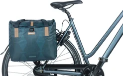 E staat voor Elegant en Eco bij deze shopper fietstas. De tas is estate blue van kleur en heeft een inhoud van 20 tot 26 liter. Daarom is de fietsshopper ideaal voor een bezoek aan de markt of de boekenwinkel. Het binnenritsvak is ideaal om je portemonnee, sleutels of andere waardevolle spullen in op te bergen.