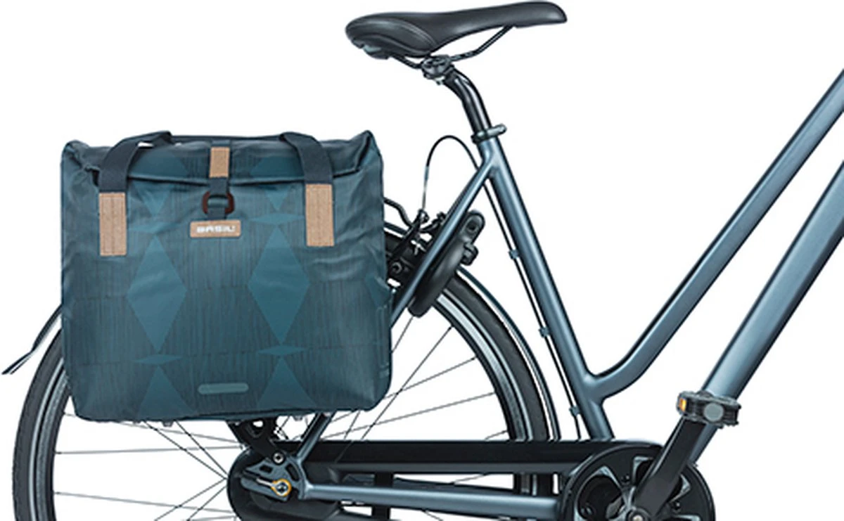 De tas is gemaakt van waterafstotend materiaal en dankzij de waterkerende vouwsluiting blijft de inhoud van je tas droog mocht er plotseling een klein regenbuitje vallen. De bodem van de fietsshopper is verstevigd en dankzij de bodemdoppen zet je de tas probleemloos op de grond zonder dat je de shopper schade toebrengt.
