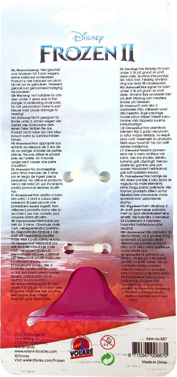 Type fiets: kinderfiets Soort artikel: Fietstoeter Materiaal : PP en metaal Montage: 100% afgemonteerd Kleur: lichtblauw/paars/roze Leeftijd: 3 – 12 jaar Licentie: Disney Frozen 2 Netto gewicht (kg): 1,0 Bruto gewicht (kg): 2,0 Doos afmeting (lxbxh): 44,0 x 39,0 x 43,0 cm