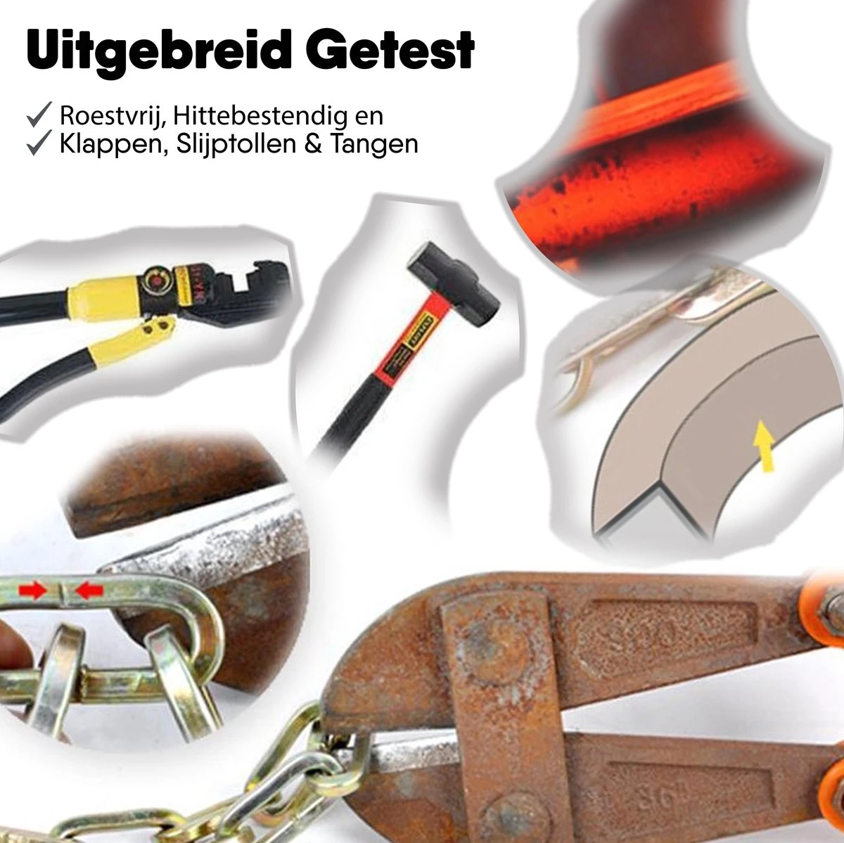 Dé LLOCX Testmethode } Sleeve gemaakt van de Premium ‘Oxford’ stof en is op lange termijn krasvrij en scheurvrij bij dagelijks gebruik. Schakelketting getest op slijptollen, boren, klappen en tangen. Roestvrij én bestand tegen extreme hitte & vrieskou.