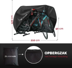 De fietshoes XXL van LOOXOLIFE® heeft een ruim formaat van 210 cm (L), 90 cm (B), 120 cm (H) en beschikt tevens over een elastische band en kliksluiting. Hierdoor kan het makkelijk worden afgesteld op elke fiets of 2 fietsen/scooter (zonder windscherm). Of plaats er 3 kinderfietsen onder!