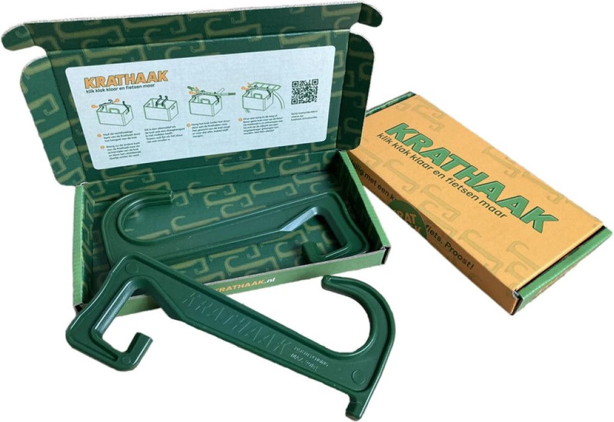 Merk: Mirage Model: Krathaak Basismateriaal: Kunststof Basiskleur: Groen Hoogte eenheid: 10 mm 100% Nederland product 20 kg. draagkracht Op meerdere manieren aan een de fiets te hangen Past op alle gangbare merkkratten