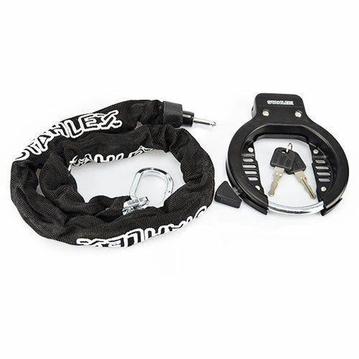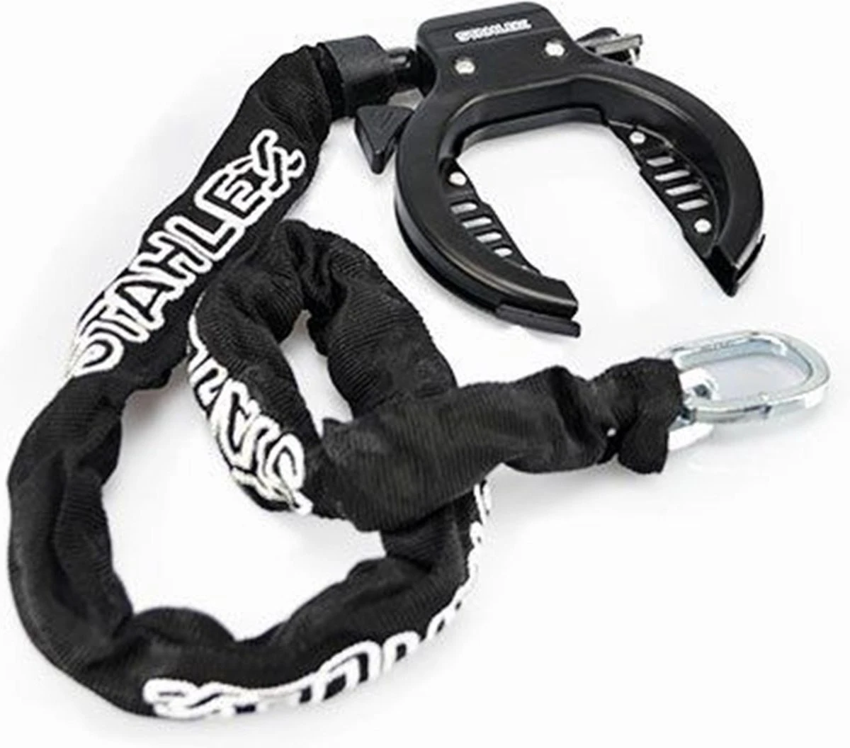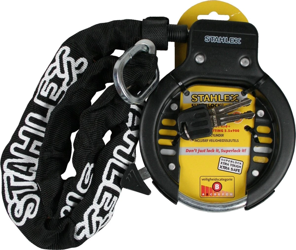 Deze Stahlex ringslot is een stevige ringslot met twee sleutels en een extra insteekketting. De insteekketting is voorzien van een canvas beschermhoes. De ketting heeft een lengte van maar liefst 90 cm.