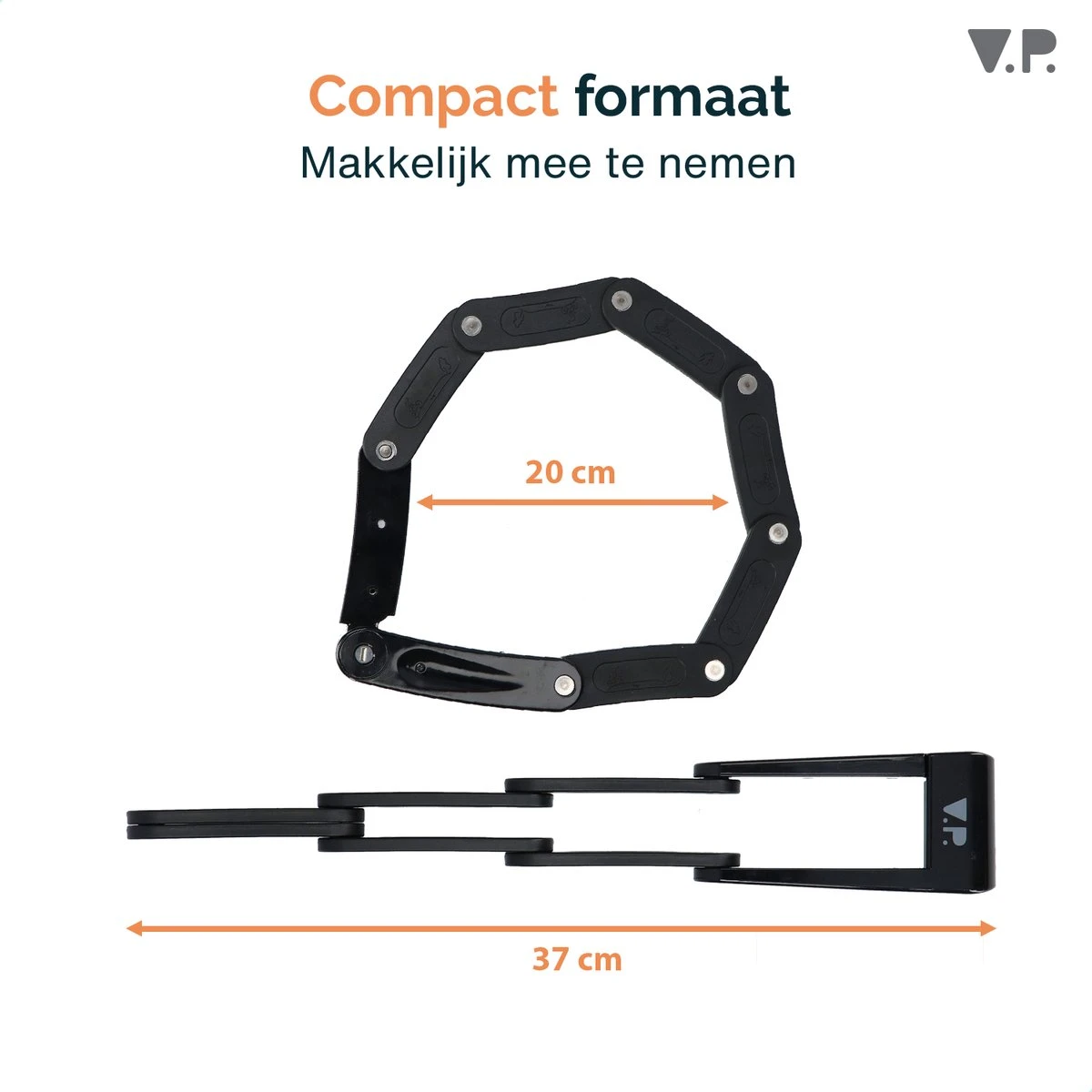 Het V.P. Vouwslot is een veilig fietsslot, gemaakt van stevige schakels die je eenvoudig kan inklapt of